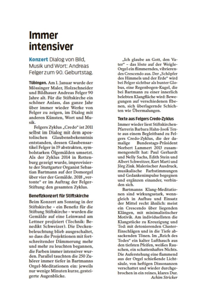 Sebastian Bartmann: Organ composition for Andreas Felger’s CREDO cycle. The recording was made on the Winterhalter organ in the Stadtkirche Böblingen in August 2019. Organist: Sebastian Bartmann, sound engineer: Piotr Furmanczyk
