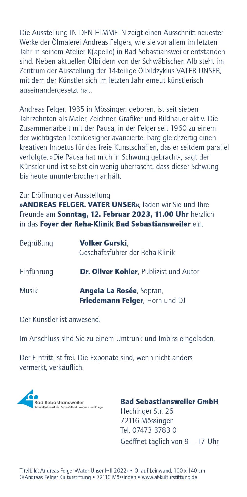 Die Ausstellung IN DEN HIMMELN zeigt einen Ausschnitt neuester Werke der Ölmalerei Andreas Felgers, die größtenteils im vergangenen Jahr in seinem Atelier K(apelle) in Bad Sebastiansweiler entstanden sind. Neben den aktuellen Ölbildern von der Schwäbischen Alb, ein Thema, das Felger bislang vor allem in Aquarellen und Holzschnitten dargestellt hat, steht im Zentrum der Ausstellung der 14-teilige Ölbildzyklus VATER UNSER. Der Titel IN DEN HIMMELN nimmt darauf Bezug und weist zugleich darüber hinaus. Damit folgt Andreas Felger dem Limburger Theologen Peter Jentzmik, dessen Neuübersetzung des Vaters Unser der Ausstellungstitel entnommen ist. Jentzmik hat sich an eine Neuformulierung dieses jahrhundertealten Gebets gewagt und auch Felgers erneute Auseinandersetzung mit dem Vater Unser entspringt seiner Sehnsucht, die Bedeutung eines der ältesten Gebete der Christenheit für unsere Zeit künstlerisch neu sicht- und lesbar zu machen.