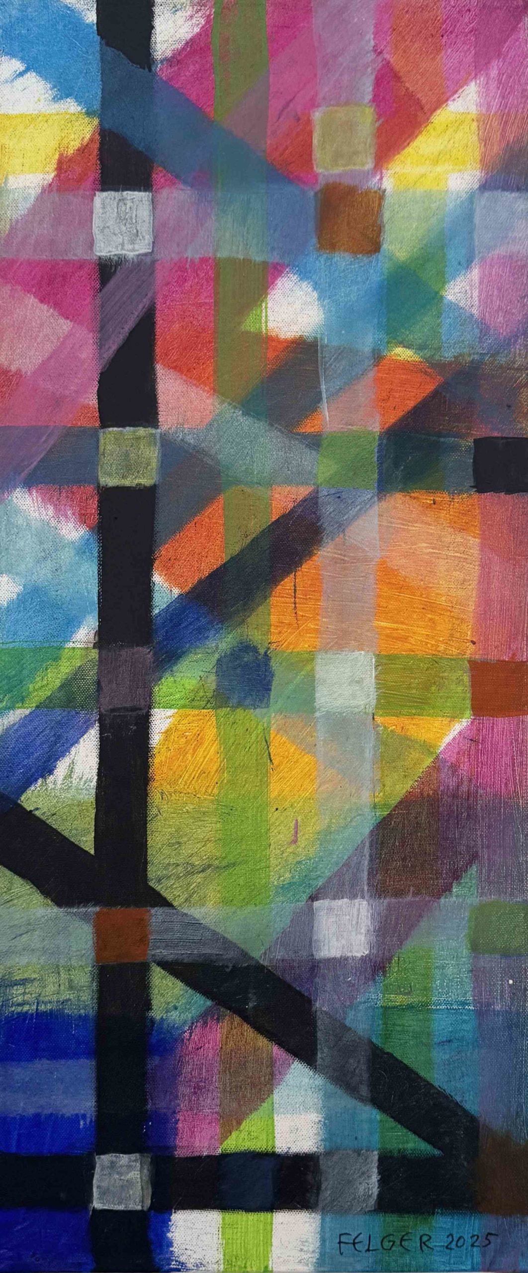 Was bedeutet dies für die Rezeption des nebenstehenden Werks? Wir folgen den Farbbahnen, beobachten die Farbmischungen an ihren Kreuzungspunkten, ‚ertasten‘ die unregelmäßigen Ränder der Linien, durchdringen das Wechselspiel teils leuchtend hervortretender und teils stumpf auf die Leinwand gesetzter Farbe. Blass weißliche Streifen sind erst nach einiger Zeit neben den dominanten dunklen Balken zu bemerken, ebenso die horizontale Dreiteilung, die sich durch kräftigen Farbeinsatz im unteren Drittel, leuchtendere Farben in der Mitte und zartere Töne im oberen Drittel der Bildfläche zeigt. In der schnell trocknenden Acrylfarbe bleibt der Abdruck der Pinselborsten im Farbmaterial sichtbar, weshalb das Leuchten der Pigmente immer verbunden mit der Textur bleibt, die durch die Pinselführung entsteht. Steht das Zusammenspiel aller Nuancen dieser Farbgebungen vor Augen – die Dauer der Betrachtung ist uns vielleicht schon nicht mehr bewusst – werden wir schließlich doch ein wenig andächtig; auch angesichts eines Bildformats, das unsere Blicke von unten nach oben emporführt, ins Hellere, Leichtere, Offenere.