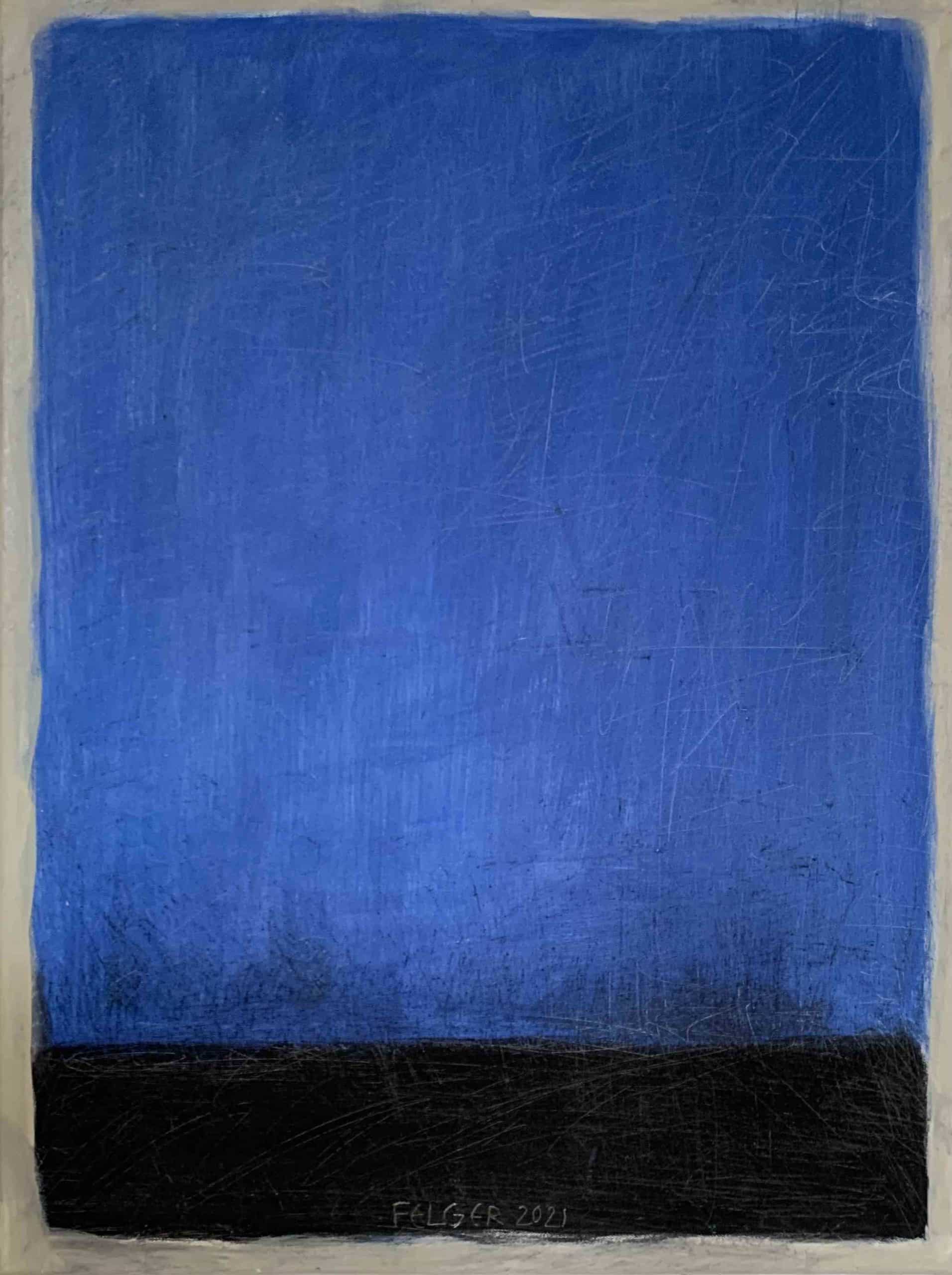 Zuletzt noch ein Vergleichsbeispiel gleichen Formats aus dem Vorjahr: Auch hier sind Hell-Dunkel-Kontraste, eine Umrandung, die das Bildzentrum hervorhebt, breite Farbflächen und feinste Linien zu finden. Auch wenn die ‚Fließ-Bilder‘ im Werk Felgers ungewöhnlich erscheinen und die Rechteckformen, Pinselspuren und Ritzungen das Handwerk des Künstlers so wie wir es kennen vergegenwärtigen, gibt es doch Gemeinsamkeiten, die die Zusammengehörigkeit der Werke bezeugen.