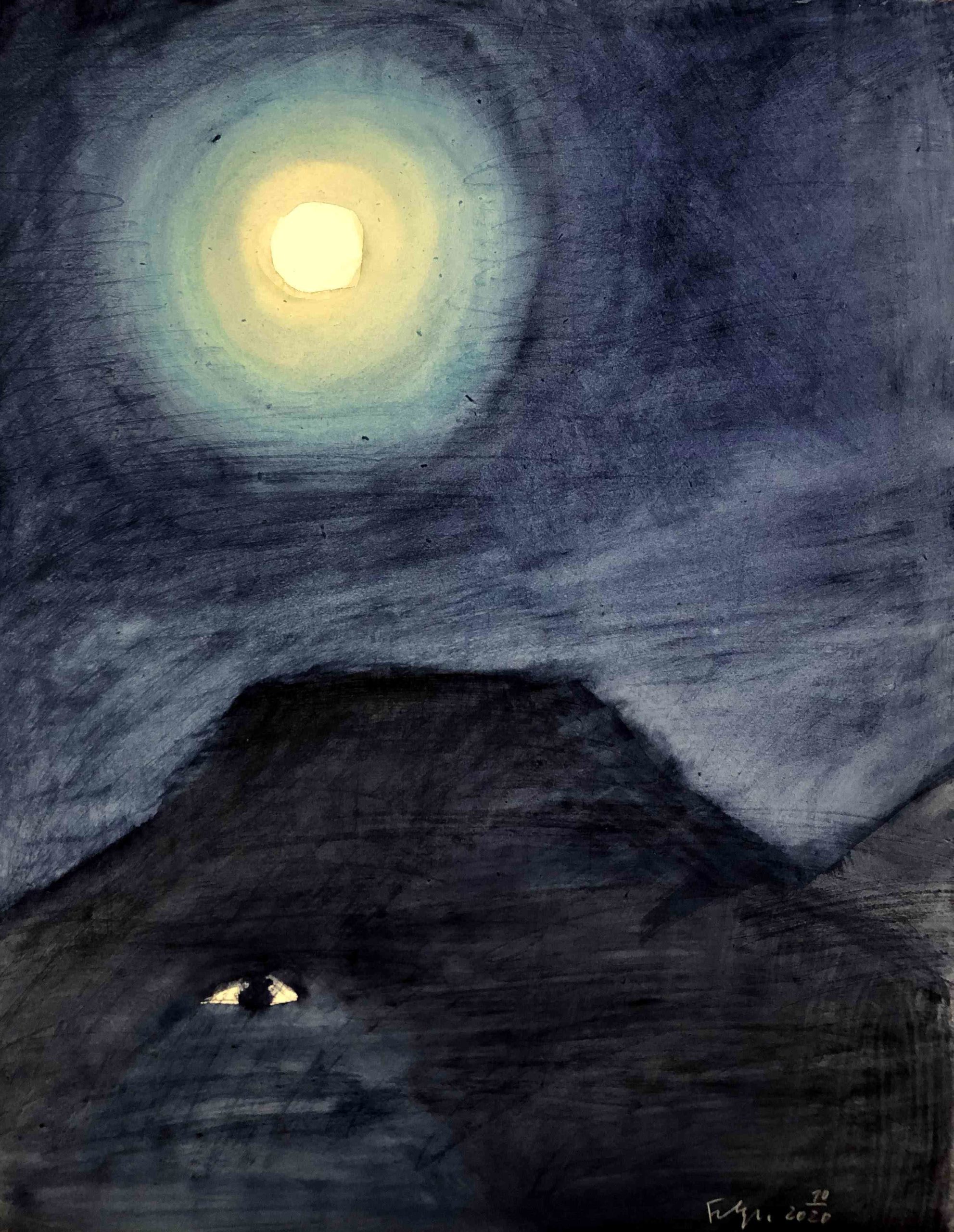 Augen-Formen begegnen uns oft in Andreas Felgers Bildern, als Teil von Figurendarstellungen ebenso wie als solitäre Formen, losgelöst von Gesichtern, in der Landschaft und in primär abstrakten Kompositionen. Die Bedeutungen dieser piktogrammartigen Formelemente variieren entsprechend der Kontexte. Oft sind religiöse Konnotationen naheliegend, wenn ein ‚Auge Gottes‘ einzeln in der oberen Bildhälfte erscheint. Auch ein Berg kann ‚schauen‘ – wie in unserem Vergleichsbild Farrenberg im Mond – und wir denken an eine personifizierte Natur, in die wir nicht nur unseren Blick versenken, sondern die unversehens zurückblickt. Durch den Blick werden Baum, Wald, Himmel zum Gegenüber, als spräche uns die Schöpfung direkt an. Man könnte meinen, dass hier ein antiker Naturbegriff mitschwingt, die Beseelung der Natur, wie wir sie aus der Mythologie kennen. In Andreas Felgers Augendarstellungen bleibt von der mythologischen Gestalt jedoch nur dieses eine Bildkürzel, eine liegende Mandelform mit einem kreisrunden Zentrum.