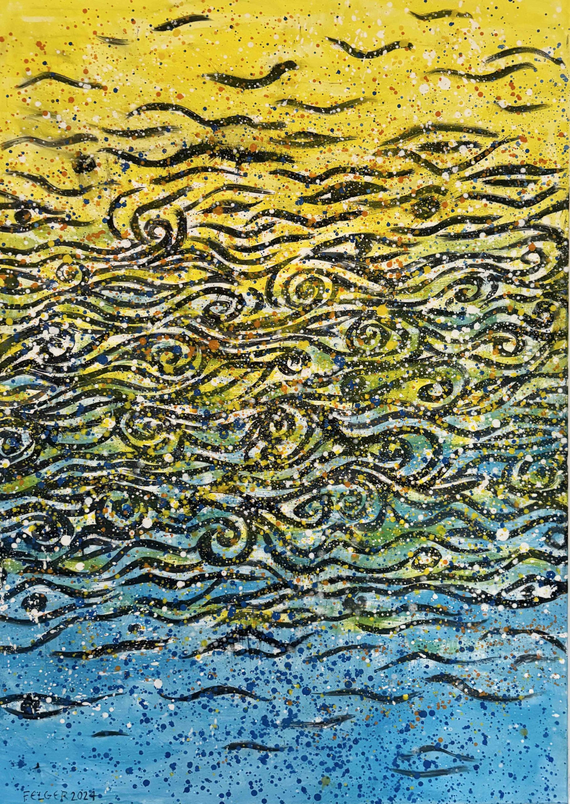 Im hier vorgestellten Ölbild aus dem Jahre 2024, ohne Titel, erscheint die Symbolik relativiert. Die Augenformen erscheinen und verschwinden, ganz so wie die Bewegungen des Wassers es nahelegen. Der Hintergrund in blauer und Sand-Farbe sowie der Vordergrund mit einer gewellten Ornamentik könnten auf eine Strand-Szene verweisen, in der sich Blicke zeigen. Sie tauchen auf und ab, gehen über in die bewegten Linien, die sich zur Bildmitte hin verdichten. Nach oben und unten öffnen sich die Strukturen gleichmäßig, wodurch die obere und untere Bildhälfte symmetrisch erscheint, wie auf dem Wasser, so an Land. Der Duktus von Andreas Felgers Pinsel-‚Schrift‘ bewegt das Auge des Betrachters geradezu spielerisch, man spürt den Schwung und das Vergnügen des Malers beim Setzen der bewegten Zeichen. Ein Übriges tun die locker über die gesamte Bildfläche verteilten Farbpunkte und -sprenkel, die luftig und leicht die Wellen- und Augen-Ornamente übersäen und ihrerseits des Betrachters Schauen in Bewegung halten. Die Pinsel-Führung des Malers, das Liquide der Farbe und das Wässrige der abgebildeten Elemente vereinen sich zu einer ebenso animierten wie ungreifbaren Bildoberfläche.
